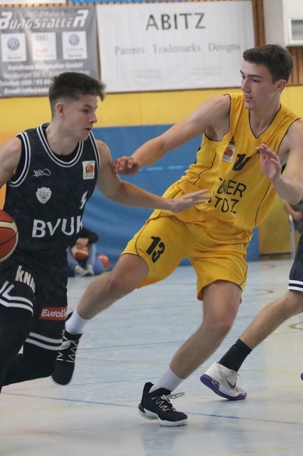 Kuriosität #2: Die Schiedsrichter treffen nicht ein, denn sie waren im Eifer der Verlegerei fälschlich irgendwo anders hingeschickt worden. Die Gastgeber telefonieren emsig, auch die Gäste aus München wollen nicht ohne Spiel nach Hause, also geht’s erst mit einer Stunde Verspätung los, mit zunächst nur einem Ref. Macht alles nix, schließlich ist Ulm der haushohe Favorit, die orangefarbene Akademie ist ja der NBBL-Staffel Südost ungeschlagen enteilt, während die Jahn-Burschen versuchen, Woche für Woche als Karpfen im Teich der Hechte zu überleben und ab und zu ein Sieglein zu ergattern. Ergo bleiben zwei der Besten des Erstliga-Nachwuchses gleich unberücksichtigt im Kader, wollen sich den vermeintlichen Ulmer Kantersieg in Zivil ansehen.