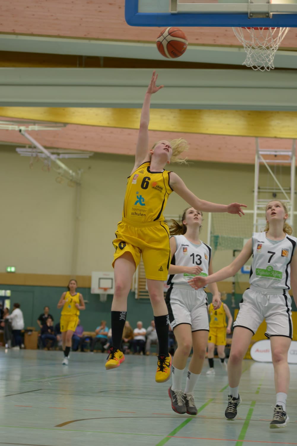 Den besseren Start hatten ganz klar die Gäste aus Würzburg, die ohne ihre Top-Schützin Jessica Schiffer angereist waren. Nach 8 Minuten stand es 12-0 aus Sicht der Würzburgerinnen. Erst 2 Minuten vor Ende des ersten Viertels brach dann endlich Kapitänin Elena Herold den Bann und erzielte die ersten Punkte für die Heim-Mannschaft. Das Händchen zitterte leider ein wenig auf Seiten der jungen Jahn Truppe (Altersdurchschnitt 18 Jahre) und man musste sich jeden Punkt hart erkämpfen (Erstes Viertel 8:17). Jedoch kam man immer besser ins Spiel, konnte das zweite Viertel knapp mit zwei Punkten gewinnen und mit einem 19:26 in die Halbzeitpause gehen. Das Team steigerte sich im Angriff und erzielte Viertel für Viertel mehr Punkte gegen die 2-3 Zone der Würzburgerinnen. Der dritte Spielabschnitt ging jedoch wieder verloren und mit einem Stand von 33:44 ging es in das vierte Viertel.