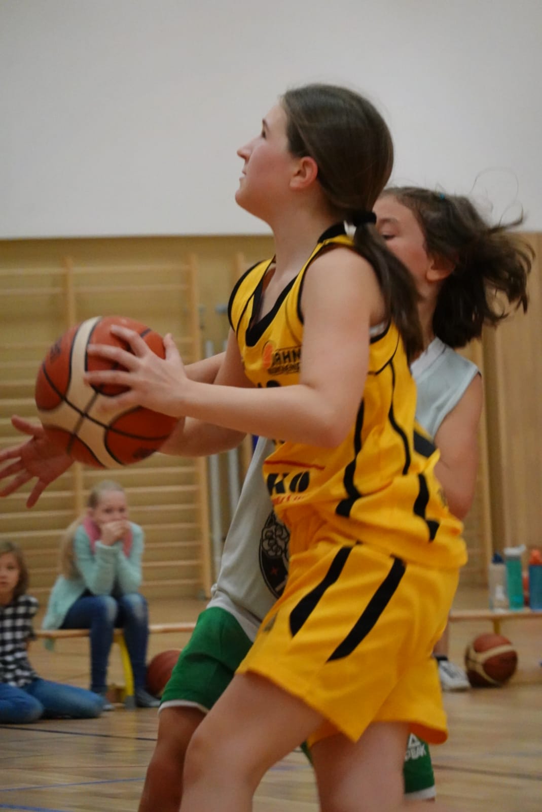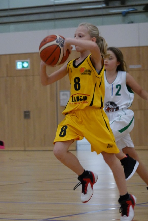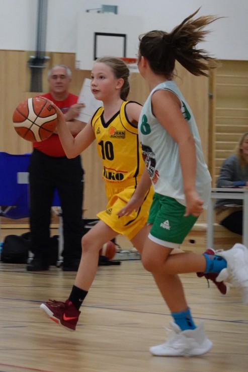 9 Jahn Mädchen der u12 weiblich liefen zum Saisonauftakt in der heimischen Halle gegen das neue Team vom Ackermannbogen auf. Nach verhaltenem Start im ersten Achtel (es wurde nach neuen Miniregeln gespielt) und einem 10:13 Rückstand, kamen die Jahnler immer besser in Fahrt. Tolles Teamplay mit schnellen Pässen führte zu einfachen Korberfolgen und der Vorsprung wuchs. Die Gäste konnten nur zu sechst antreten und ab der Halbzeit schwanden die Kräfte, aber es wurde tapfer weitergespielt und um jeden Ball gekämpft. Der Sieg viel dann mit 120:36 recht hoch aus, aber alle Spielerinnen hatten sich den Applaus von der Tribüne verdient.