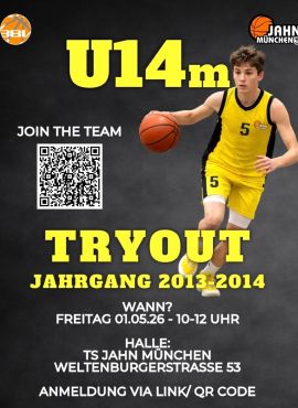 11.04 11.04.2026 07:54 von Arturo Raichel Tryouts U14m Für die U14m (Bayernliga) und U13m (Landesliga) suchen wir ab sofort Talente, die Bock haben auf dreimal die Woche Training unter leistungsorientierten Voraussetzungen mehr