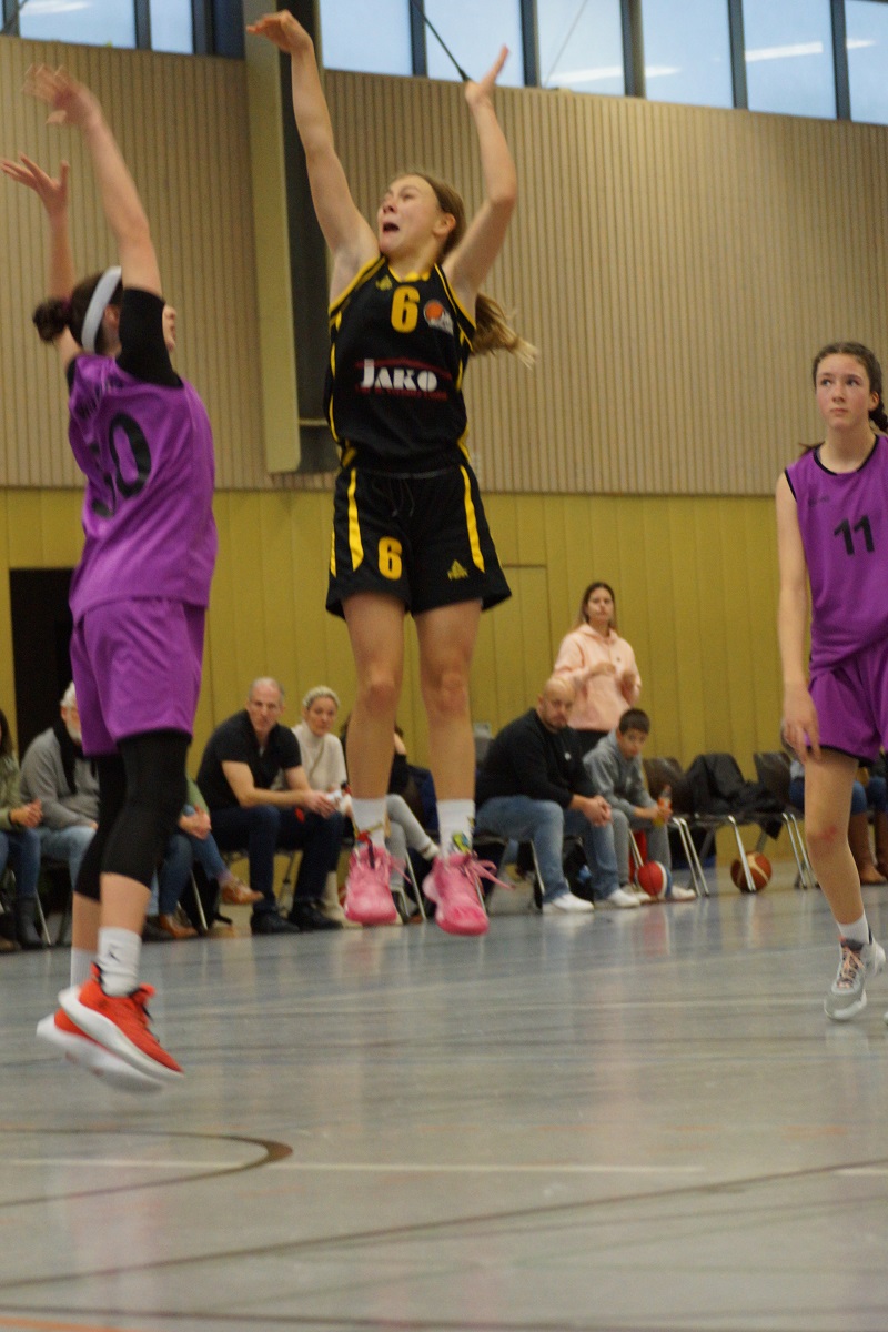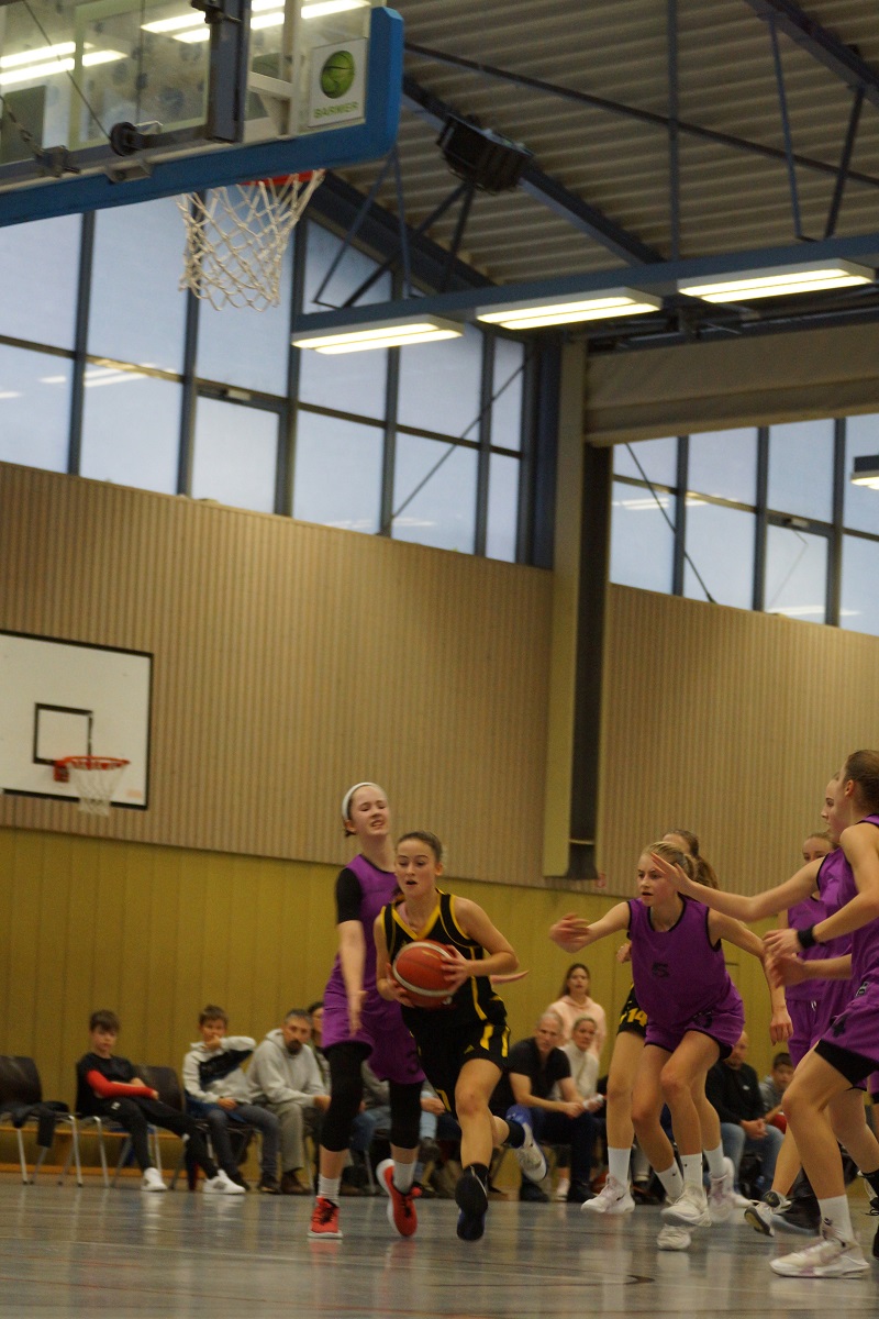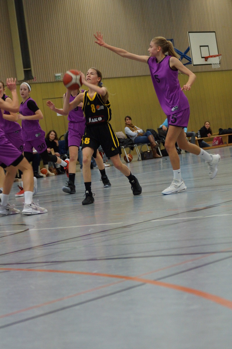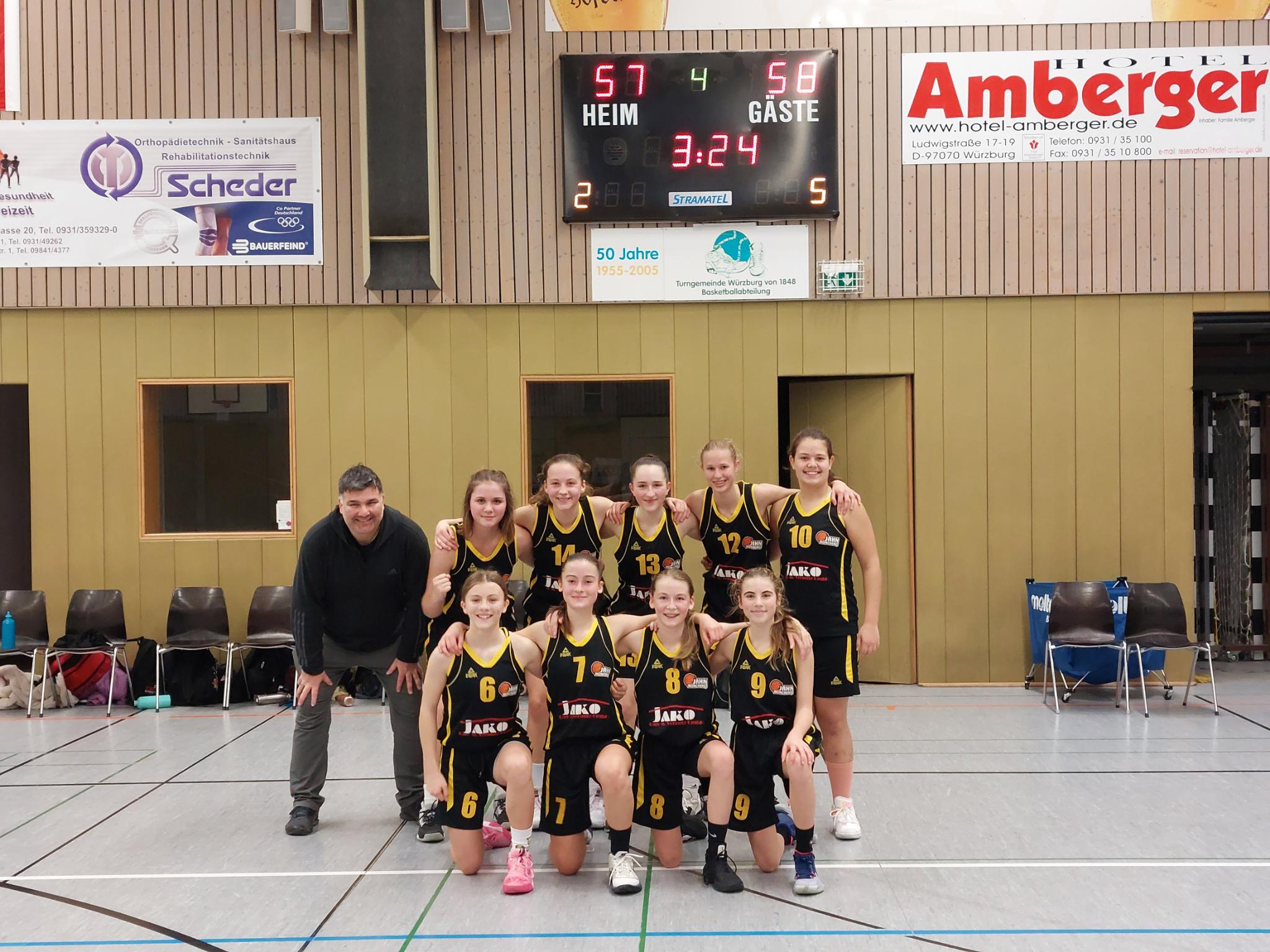 Das wbl u14 Team der Turnerschaft absolvierte im Oktober die Hinrunde mit 5 ungefährdeten Siegen und im Schnitt +60 Punkten recht souverän. Die intensive Vorbereitung mit Trainingslager in Burghausen, etlichen Trainingseinheiten und einer Rekordteilnahme von 18 Spielerinnen im BBV Girlscamp zahlte sich aus. Das Scoring verteilt sich meist auf einen Großteil der Spielerinnen, so daß es gegnerische Teams schwer haben, die Offensive der Jahn Mädls zu stoppen. Damit hatte sich das Team für die Hauptrunde der 6 besten Teams aus Bayern qualifiziert, von denen dann Ende März die 4 Besten die Meisterschaft ausspielen werden. Die kurze Pause in den Herbstferien wurde genutzt, um sich in Berlin mit einigen der besten Teams des Landes zu messen. Neben dem Gastgeber ALBA waren auch noch Lok Bernau und die Basketball Allianz Süd Südwest (B.A.S.S.) aus der Hauptstadt dabei. Und mit der TG Würzburg auch der Hauptkonkurrent aus Nordbayern, die ebenso souverän und ungeschlagen die Hauptrunde erreicht hatten.Mit dem SC Kemmern im 1.Spiel der Hauptrunde kam ein bekanntes Team nach München, hatten doch die 2010er sich erst im Mai in der u12 dem Gegner im Kampf um die bayerische Meisterschaft geschlagen geben müssen. Aber diesmal wurde ein deutlicher Sieg eingefahren, mit 88:43 setzte die Jahntruppe ein erstes Ausrufezeichen in der Hauptrunde.Diesen Samstag kam es dann zum Spitzenspiel in Würzburg. Der Gastgeber als amtierender dt. Meister konnte mit 4 Spielerinnen auflaufen, die frisch vom BBV für ein Länderturnier in Chemnitz nominiert wurden. Auf Seiten des Jahn hatte es nur eine Spielerin geschafft, auf dem Papier also eine recht deutliche Angelegenheit. Aber sofort ab Tip-off konnten die Jahn Mädls einen kleinen Vorsprung erarbeiten, das 1.Viertel wurde mit 20:15 gewonnen. Der Gastgeber konterte aber und und nutzte immer wieder Chancen aus dem Fastbreak, so daß Würzburg mit einer 31:28 Führung in die Halbzeit ging.Das Spiel blieb auch im zweiten Abschnitt hart umkämpft, Jahn haderte mit der Freiqurfquote (magere 17% bei 2/12). Würzburg konnte deutlich öfter an die Linie gehen und traf sicher (62% bei 16/26). Das Spiel schien immer mehr in Richtung des Gastgebers zu kippen. Am Anfang des 4.Viertels dann das 5.Foul unseres Captains Eva. 5min vor Schluß dann schon mit 7 Punkten hinten und 3min später holte sich auch Topscorerin Silvia ihr 5.Foul ab. Doch das alles schien beim Rest des Teams nochmal eine Trotzreaktion auszulösen. Auf einmal wurden Bälle geklaut und die Korbleger sicher verwandelt. 90sec for Schluß dann wieder Isabelle mit energischem Drive zum Korb, Ausgleich zum 56:56. Alicia krönte ihre tolle Leistung an diesem Tag dann mit weiteren zwei Punkten. Noch 33sec auf der Uhr, Würzburgs Topscorerin Laura zog zum Korb und wurde gefoult, zwei Freiwürfe. Auszeit Jahn, jetzt saß niemand mehr in der Halle. Erster Freiwurf daneben, zweiter drin. Die restlichen 13sec brachte Joana den Ball sicher über die Mittellinie und als der Schlußpfiff dann den 58:57 Sieg besiegelte, kannte der Jubel bei Jahn keine Grenzen. Damit ist man als einziges ungeschlagenes Team an der Spitze. Aber wie heißt es so schön: "Man sieht sich immer zweimal im Leben". So auch im Basketball, wenn Anfang März die Würzburger in die Landeshauptstadt reisen. Dort wird dann entschieden, wer als Erster der Hauptrunde die Meisterschaft austragen darf. Mark your calenders!