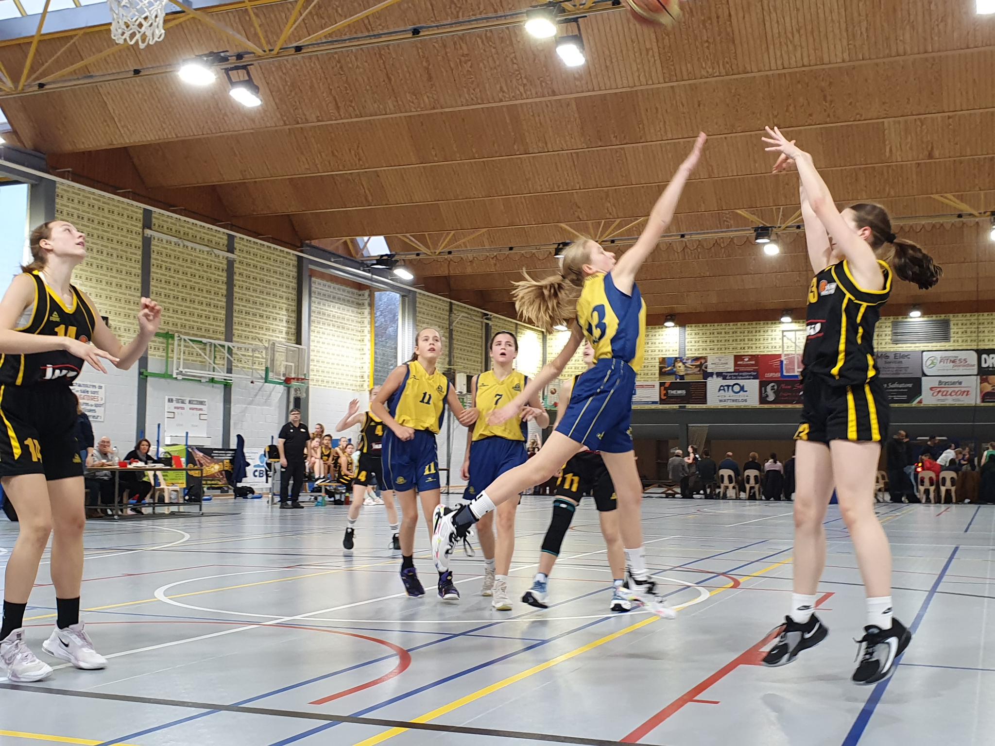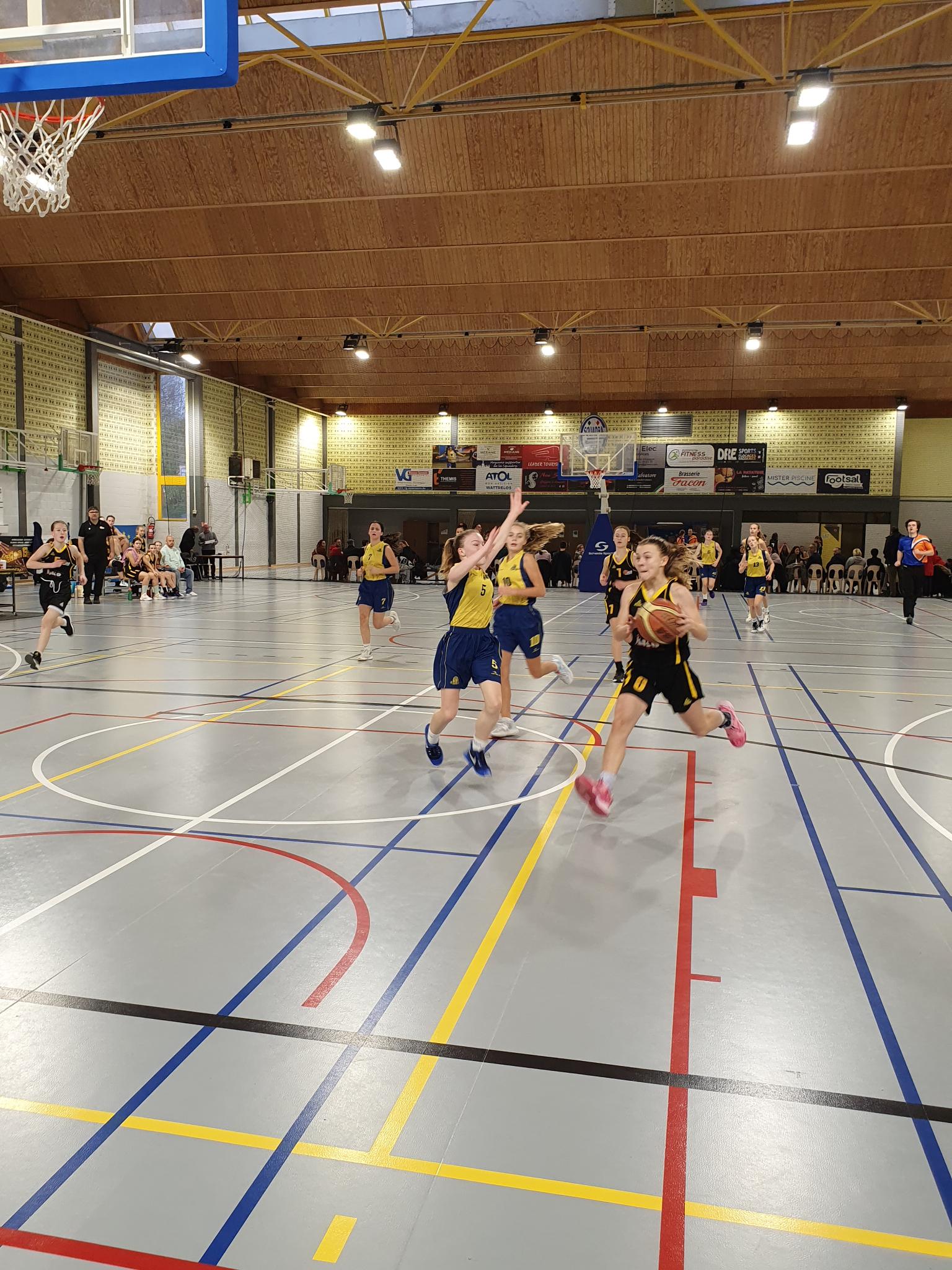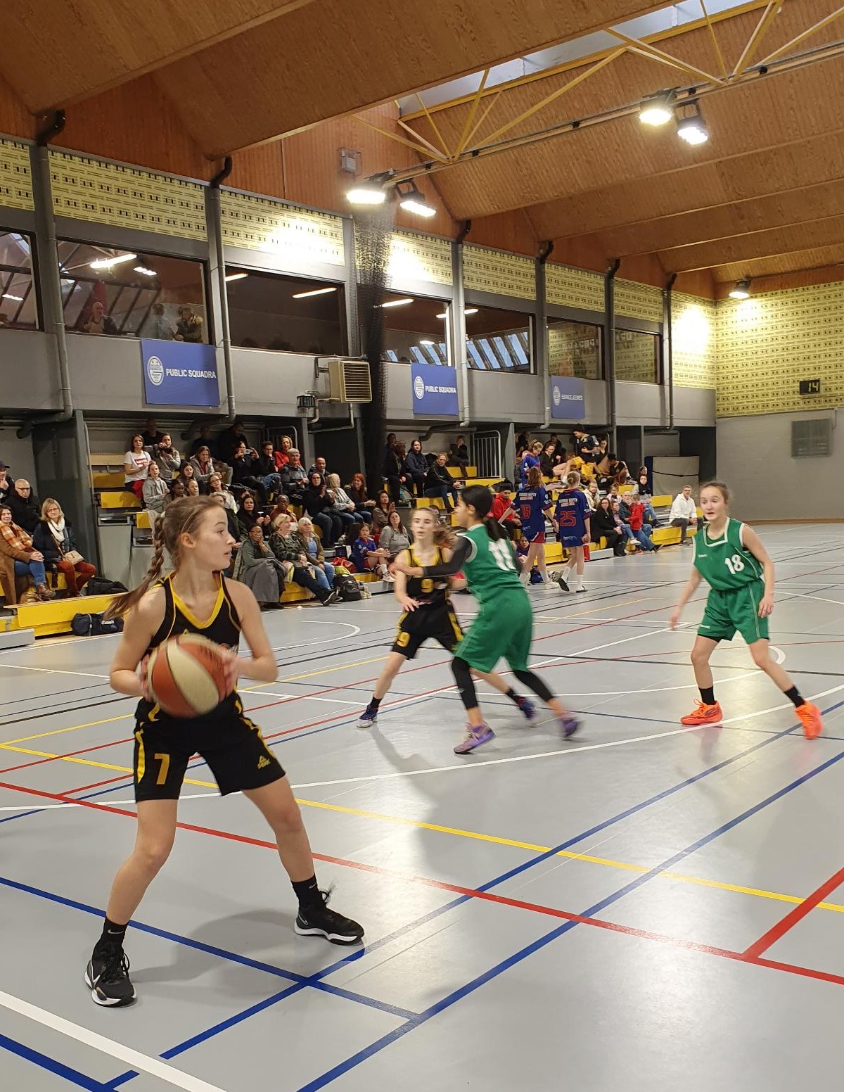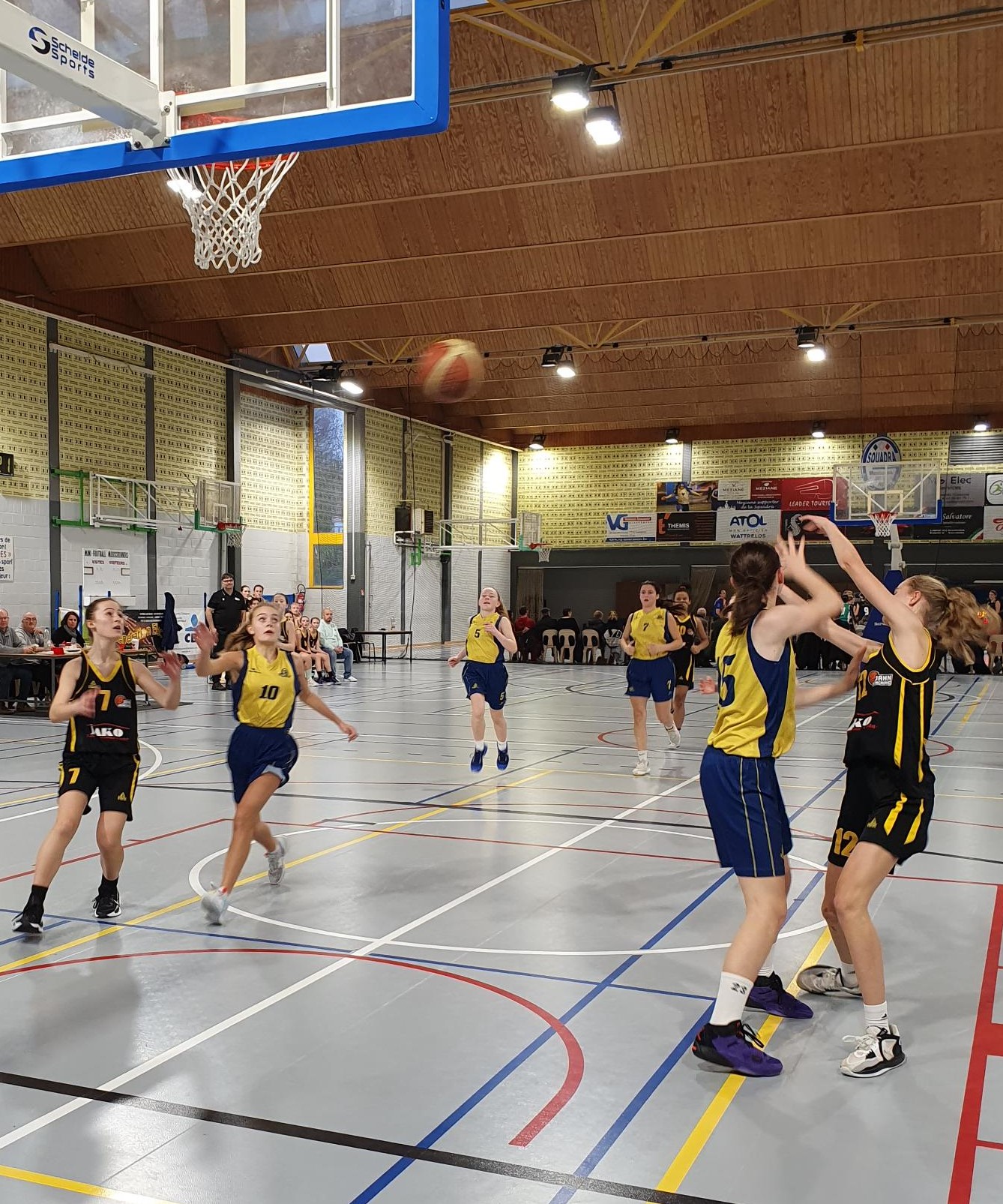 Am 2.Tag dann das letzte Gruppenspiel gegen die auch noch ungeschlagenen Mädchen von Castor Braines. Ein intensives Spiel entwickelte sich, letztendlich konnten wir uns aber in der 2.Halbzeit absetzen und das Spiel sicher nach Hause bringen. Elena immer wieder als Energizer von der Bank mit guten Aktionen in der Defense, Joana zeigte mehrmals ihren soften Touch beim Wurf. Und Leony sammelte fleißig Rebounds und konnte ihre meist größeren Gegnerinnen vor sich halten. Damit stand fest, wir sind abends um 19Uhr im Halbfinale gegen das lokale Team aus Waregem. Leider waren keine Shuttles verfügbar, so daß wir 4h in der Halle verbringen mußten, da das Wetter auch eher mäßig war. Trotzdem wurde die Konzentration wieder hochgefahren und es gelang ein guter Start ins Spiel. Leichte Führung für uns nach Viertel #1, ein paar Punkte Rückstand zur Halbzeit. Doch letztendlich noch zu viele leichte Fehler, die der Gegner clever ausgenutzt hat. Beim Stand von -20 wurde dann nochmal Spielzeit verteilt, mit -32 am Ende eine deutliche Niederlage.